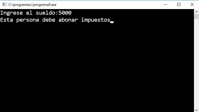 Podemos observar lo siguiente: Siempre se hace la carga del sueldo, pero si el sueldo que ingresamos supera 3000 pesos se mostrará por pantalla el mensaje «Esta persona debe abonar impuestos», en caso que la persona cobre 3000 o menos no aparece nada por pantalla.