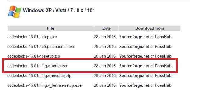 Es importante descargar el «codeblocks-16.01mingw-setup.exe» que viene con el editor de texto codeblocks y el compilador del lenguaje C llamado MinGW.