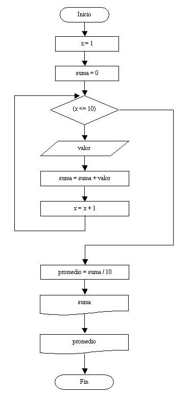 El promedio se calcula al salir de la estructura repetitiva (es decir primero sumamos los 10 valores ingresados y luego los dividimos por 10)