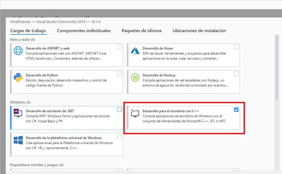 Cuando procedamos a instalar debemos seleccionar como mínimo «Desarrollo para el escritorio con C++»:
