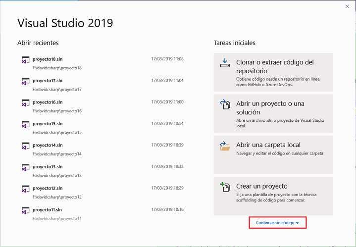 Aparece un diálogo donde tenemos distintas opciones para abrir proyectos anteriores, clonar proyectos almacenados en GitHub etc, nosotros elegiremos la opción de ‘Continuar sin código’ para conocer el entorno de Visual Studio 2019:
