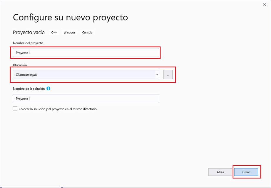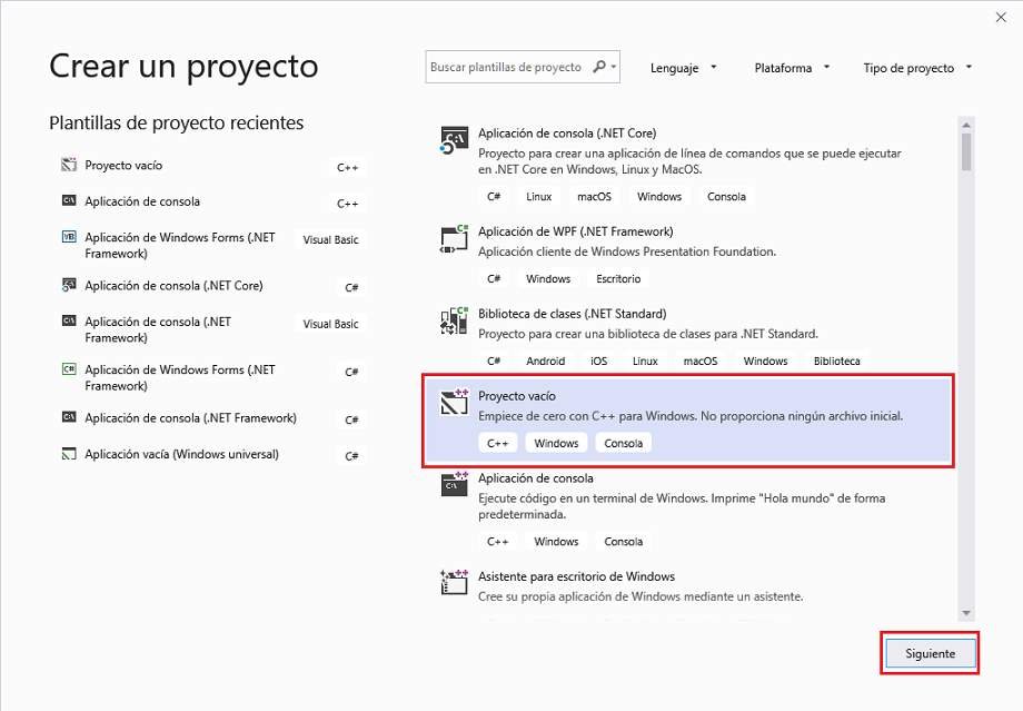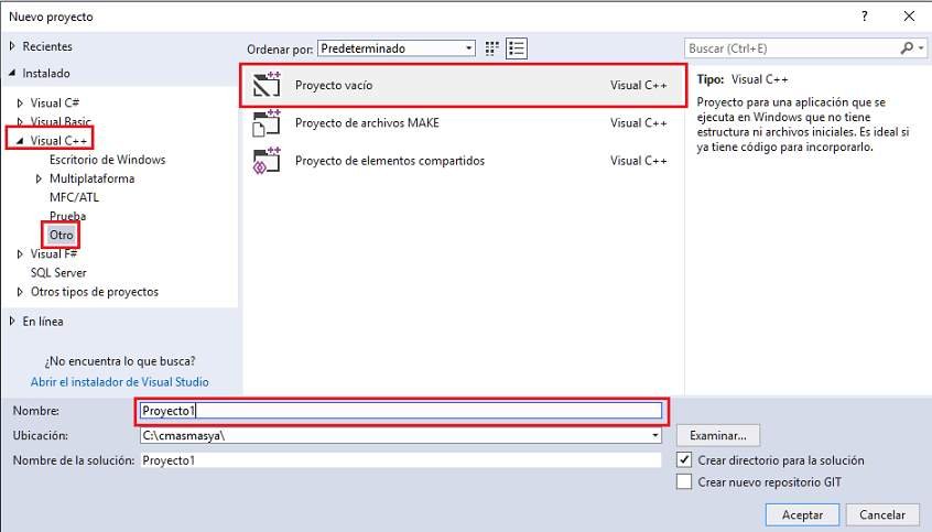 Aparece un diálogo donde debemos seleccionar «Proyecto vacío» para el lenguaje C++ Windows Consola: