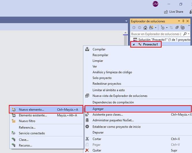 Como hemos creado un proyecto vacío debemos crear un archivo donde codificaremos nuestro programa, para esto tipeamos el botón derecho del mouse sobre el nombre del proyecto («Proyecto1») en la ventana del «Explorador de soluciones» y seleccionamos la opción «Agregar»->»Nuevo elemento»: