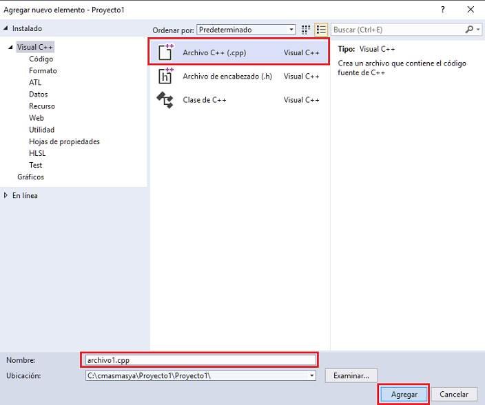 Aparece un diálogo donde debemos seleccionar la opción de «Archivo C++» y definir el nombre del archivo a crear (lo llamaremos archivo1):