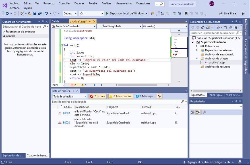 Como podemos observar aparece subrayado la línea donde disponemos Cout con mayúsculas como en la línea que imprimimos la variable superficie con mayúsculas. Si modificamos y corregimos los dos errores sintácticos podremos ejecutar nuestro programa.