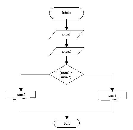 Se hace la entrada de num1 y num2 por teclado. Para saber cual variable tiene un valor mayor preguntamos si el contenido de num1 es mayor (>) que el contenido de num2, si la respuesta es verdadera vamos por la rama de la derecha e imprimimos num1, en caso que la condición sea falsa vamos por la rama de la izquierda (Falsa) e imprimimos num2.