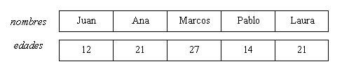 Si tenemos dos vectores de 5 elementos cada uno. En uno se almacenan los nombres de personas en el otro las edades de dichas personas.