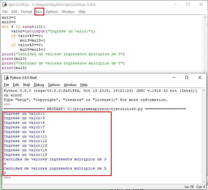Escribir un programa que lea 10 números enteros y luego muestre cuántos valores ingresados fueron múltiplos de 3 y cuántos de 5. Debemos tener en cuenta que hay números que son múltiplos de 3 y de 5 a la vez.
