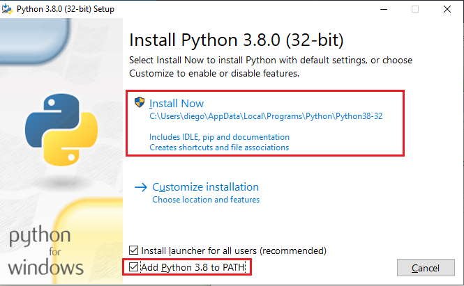 Ejecutamos el programa que descargamos y procedemos a instalarlo (marcamos ‘Add Python3.8 to PATH’):