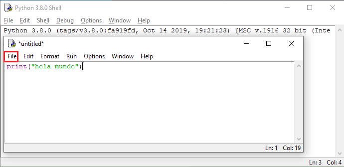 En esta nueva ventana debemos codificar nuestro programa en Python, el programa mínimo es mostrar un mensaje por pantalla: