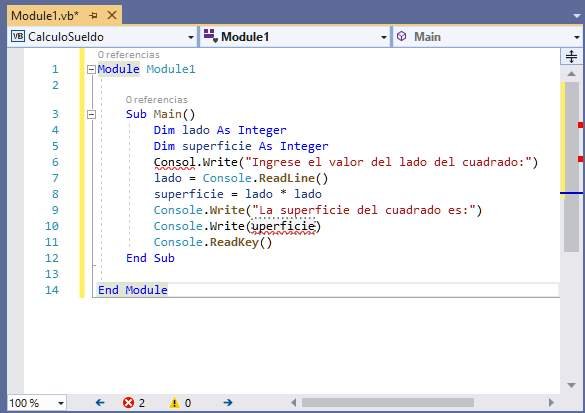 Codificamos el algoritmo en Visual Basic .Net e introducimos dos errores sintáctico: