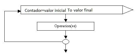 En su forma más típica y básica, esta estructura requiere una variable que cumple la función de un CONTADOR de vueltas. El primer valor que indicamos es el valor inicial que toma el contador. Cada vez que se ejecuta el bloque a repetir el contador se incrementa en uno y si no supera el valor final especificado en el For vuelve a ejecutar el bloque.
