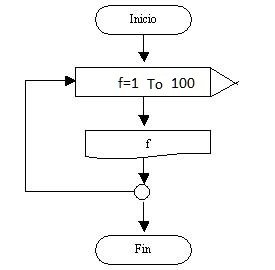 Cuando la variable del For llega a 101 sale de la estructura repetitiva y continúa la ejecución del algoritmo que se indica después del círculo.