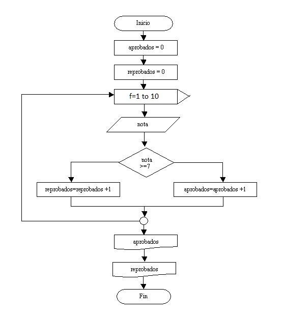 Dentro de la estructura repetitiva debemos hacer la carga de la variable nota y verificar con una estructura condicional si el contenido de la variable nota es mayor o igual a 7 para incrementar el contador aprobados, en caso de que la condición retorne falso debemos incrementar la variable reprobados.